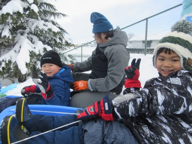 たくさん雪が積もったので、みんなで小学校の築山へそりをしに出かけました。ばら組さんを先頭に深い雪道をかき分け、倒れそうになりながらも力強く進んでいきました。圧雪していない場所は最初はそりが滑らず、交代しながら何度も滑って道をつくりました。勢いが出てくるとスピードが速くなり、遠くまで滑ることを楽しんでいました。小学生のお兄さんやお姉さんとも一緒にそり滑りをして、楽しい時間になりました。