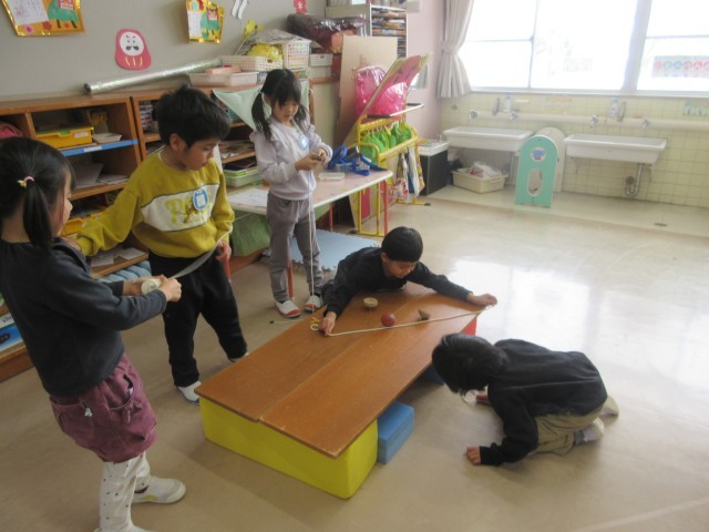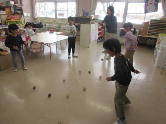コマを回せるようになると、台の上で回せるかに挑戦したり友達と競ったりして遊んでいます。また、友達を誘い「みんなで一緒に5個コマを回そう」と、協力しながらいくつコマを回せるかにも挑戦しています。始めは「できない」「無理だよ」と言っていた子どもたちでしたが、難しくても諦めずにやってみようとする姿に成長を感じ、うれしく思いました。