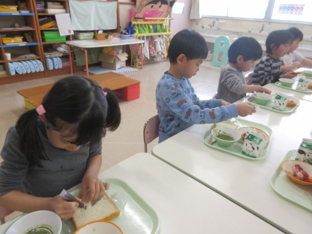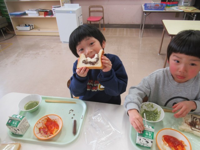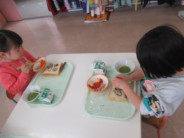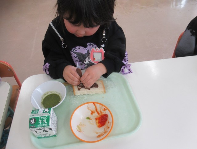 給食が始まると、パンに「何描こうかな」と考える子や「私は顔を描こう」と自分の顔を描く子、好きなキャラクターの絵を描く子などそれぞれに楽しんで絵を描いていました。描いた後は早速、パンを口いっぱいにほおばり、とても美味しそうな表情を見せていました。