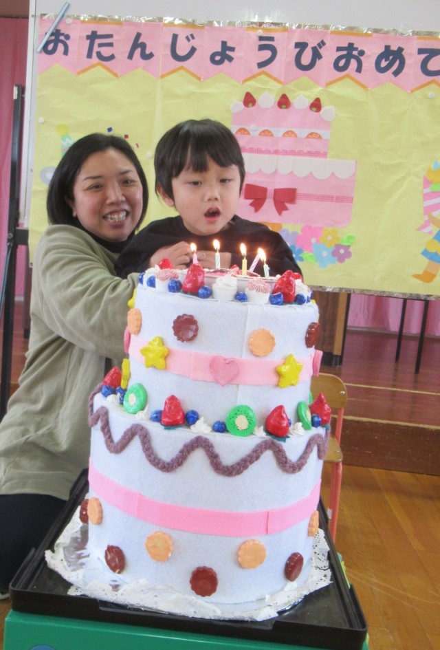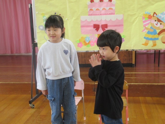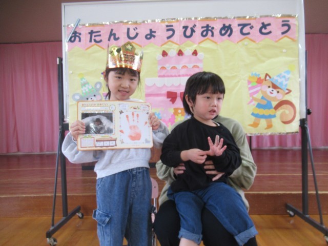 入場からみんなにたくさんの拍手でお祝いされ、笑顔いっぱいの誕生月の友達でした。