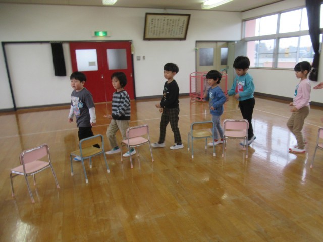 お楽しみコーナーでは『椅子取りゲーム』をしました。先生たちも加わって、最後の椅子を取るために競い合いました。子どもたちは「椅子に座る!絶対勝つ!」と真剣な表情でした。2戦して、1戦目は園長先生とばら組の友達が残り、園長先生が勝つと「もうちょっとだったのに」と悔しそうでした。もう1戦は、その悔しさを晴らすために頑張り、ばら組の友達が勝つと、対戦後にみんなが「やったね」「すごいね」と駆け寄り、一緒に喜んでいました。友達の頑張りを認め合えるみんなが素敵でした。