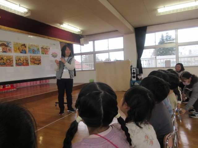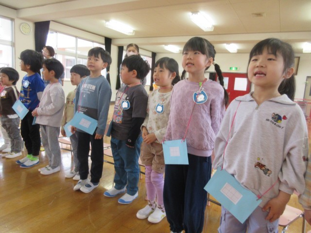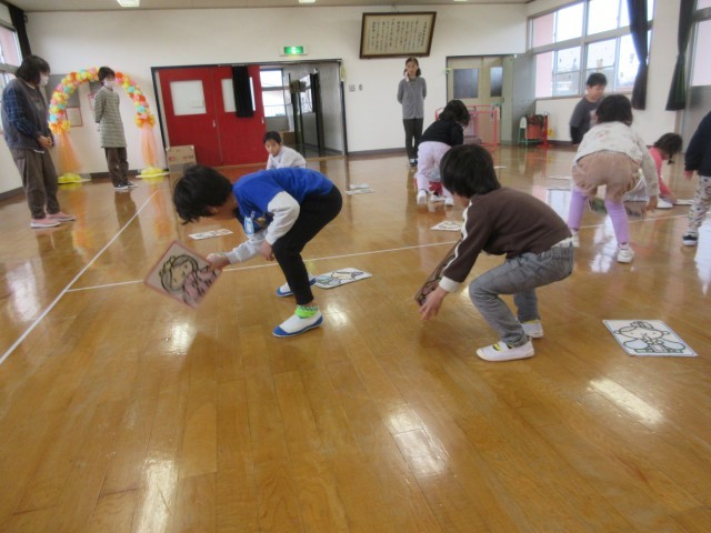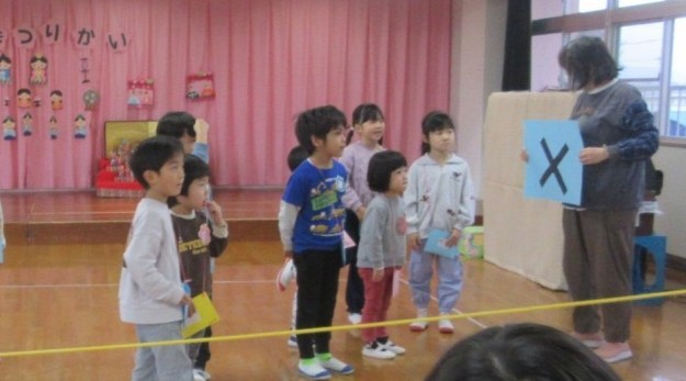 ひな祭り会をしました。はじめに、園長先生からひな祭りの由来を聞き、歌を歌いました。その後は、楽しいゲームが3個あり『お雛様・お内裏様カード探し』『〇×クイズ』『パタパタゲーム』と楽しみました。