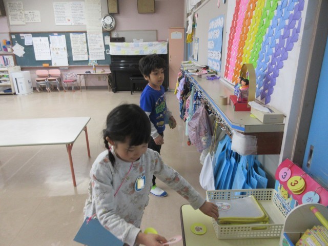 カード探しでは、園内に隠してあるカードを各年齢のミッションに合わせて探してくることになっていて、子どもたちは必死に探し、見つけた時には「やった!あった!」と大喜びでした。〇×ゲームでは、園長先生から聞いた由来からのクイズもあり「えっと~」と悩む子や「簡単」とすぐに分かれる様子が見られました。パタパタゲームでは、お雛様・お内裏様チームに分かれカードをめくりあう競争です。どちらが多くカードをめくるかで勝敗が決まり、2回戦したところ1対1の引き分けでした。