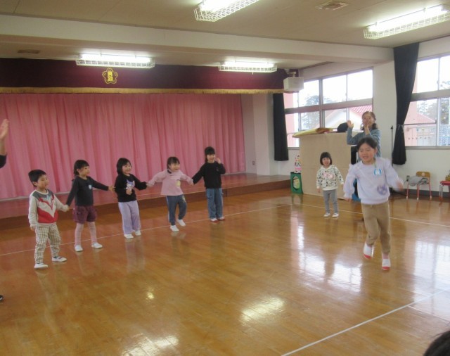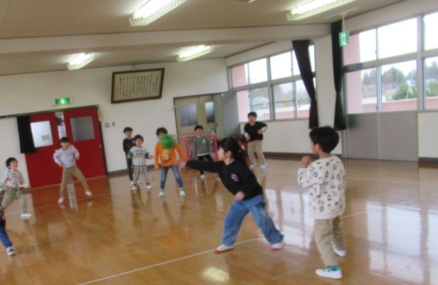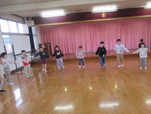 お楽しみコーナーではみんなで「ドッジボール」と「誕生月仲間」をして楽しみました。ドッジボールでは、ばら組のボールの勢いを感じながらうさぎ組ももも組も一生懸命取り組んでいました。誕生月仲間は、自分の誕生月が呼ばれると少し恥ずかしそうにみんなに見守られスキップして踊る子どもたちでした。