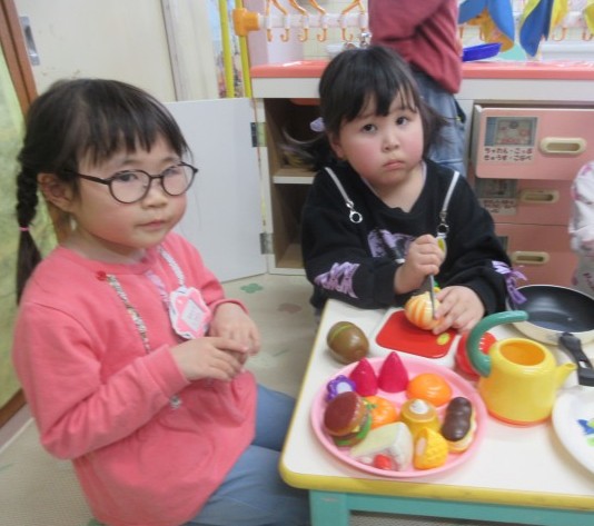 もも組、うさぎ組の子どもたちはお部屋でままごとをしたり、好きなキャラクターのお面をつくったり、縄跳びをしたりなど自分のしたい遊びを見つけて遊んでいます。ディズニーランドごっこでは、ばら組の友達と一緒に♪ジャンボリミッキーや♪ハッピージャムジャムを踊っています。楽しそうな声が聞こえると「何をしているのかな?」とすぐに友達の近くに集まってきて遊びの仲間が増えていきます。