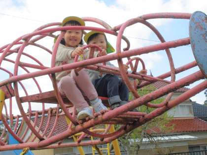 年少の時から憧れていた飛行機ジムに挑戦を始めました。高さがあるので、少し怖い気持ちもありますが、友達の姿に刺激を受けて手や足を動かしながら、滑り台や操縦席を目指して頑張っています。操縦席に座った子たちは「高いね〜、二階の部屋も見えそう」「おーい、みんな〜!」と嬉しそうに話したり声をかけたりしています。