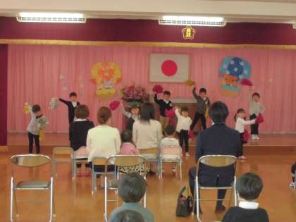歓迎会では、うさぎ組さんとばら組さんが素敵なダンスや手遊び、歌を披露してくれました。今日の日のために練習をしてきた子供たちなので、とてもはりきっていましたよ。新しいお友達も、知っている歌や手遊びが始まると、自然と体が揺れたり、手を動かしたりして楽しんでいました。可愛いお友達が増えて、月曜日からまた賑やかになりそうです♪