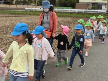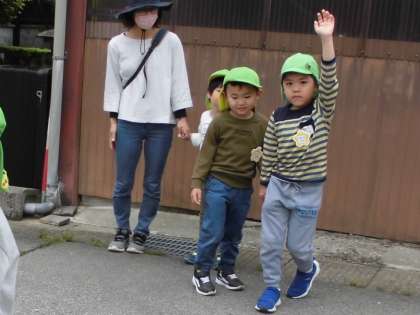 今日は安全指導をしました。道路の渡り方について紙芝居を使って知らせ、実際に道路を歩きました。右側を歩くこと、道路を渡るときは「止まる」「右左を見て車が来ないか確認する」「耳で車の音を聞く」「手を挙げて渡る」ことを確認しました。車に気を付けて歩けるよう繰り返し知らせていきたいと思います。