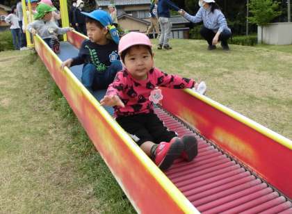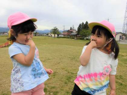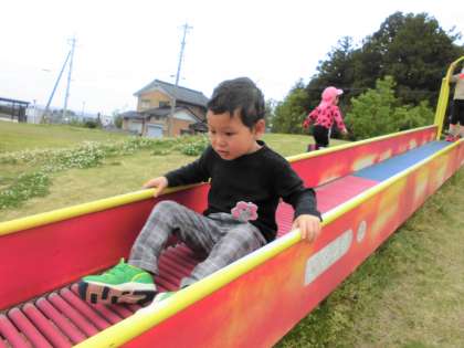 交通安全の話を聞いた後、ばら組さんとうさぎ組さんと初めて一緒に散歩に行きました。しっかりお兄ちゃんお姉ちゃんと手を繋ぎ、列になって上手に歩くことができましたよ。壇の山公園では、滑り台をしたり、虫探しをしたり、花を摘んで指輪にしたりして、たくさん遊びました。初めていった壇の山公園はとても楽しかったようで、園に戻った後も「すごい楽しかったね」「歩くの大変だったけど、楽しかったよ」とたくさん話しをしてくれましたよ。