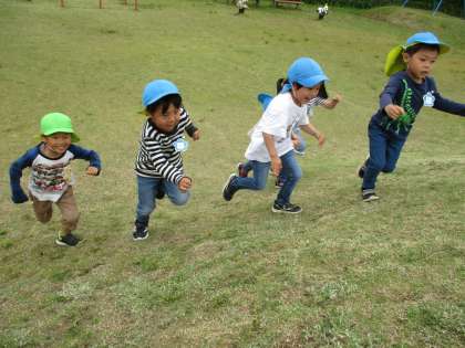 壇の山公園では芝生を走ったり、傾斜の芝生をのぼりっこ競争をしました。繰り返しのぼることを楽しむと「今度は手をつかないようにしよう」「速くのぼれた」と声を掛け合う場面も見られました。上る遊びから傾斜で「だるまさんが転んだしよう!」という声が聞かれ、だるまさんが転んだも楽しみました。また、晴れた日には散歩に出かけましょうね!
