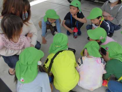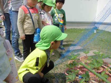 今日は、うさぎ組で月見町方面へ散歩に行ってきました。二人の友達の家に立ち寄らせてもらい、産まれたばかりの「おたまじゃくし」を見せてもらったり、園でよく話をしていたイチゴや野菜の畑を見せてもらったりしました。どちらも興味深く見ていて「おばあちゃんトマト植えるって言ってた」「僕の家にもイチゴ育てとるん」と、初めて聞かせてもらうような話が次々に聞かれ、実際にいろいろな物を見ることで自分の経験を思い出し、伝えたい気持ちに繋がることを感じました。お母さん方が待っていてくださりうれしかったですね。