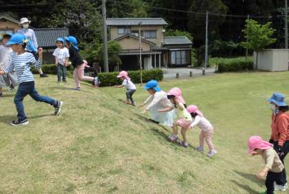 今日もばら組さんと一緒にお散歩が行けることを話すと「やったー!」と大喜びの可愛い子供たち。壇の山公園に行くと草がきれいに刈ってあり、坂をお尻で滑って遊ぶばら組さん。その姿を見て「私も!」と滑って楽しみました♪登るのに一苦労のもも組さんですが「滑りたい!」の気持ちでたくさん登って遊びましたよ。「だるまさんころんだ」にも混ぜてもらい、一緒にたくさん遊べて嬉しかったね!