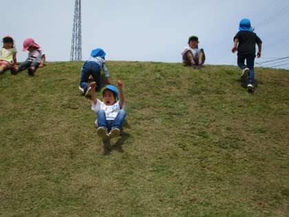 今日はもも組さんと一緒に手をつないで壇の山公園まで散歩に行ってきました。公園に行く前には「今日もだるまさんがころんだしたい」「山登り競争したい」と子供たち。公園につくと滑り台へ一直線!何度も滑り台を楽しみ、もも組さんと一緒に滑ってあげる姿もありました。「よーい、ドン」で芝生の傾斜を駆け上ると、今日はそのままお尻ですべりました。繰り返し滑るとコツが分かり、足を上げて角度をつけてすべっていました。
