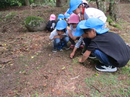 帰りは壇山神社に寄り道しました。神社に足を踏み入れると…体の色を変えたカエルたちが一斉にピヨーン!「カエルおった」「ここにもおった」とカエルをじっくり見つめる子供たちでした。