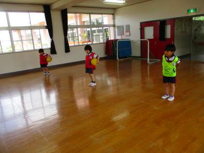 子供たちが楽しみにしていたサッカー教室でした。コーチの話を聞き、まずは友達とぶつからないように広いスペースを探しながら遊戯室を歩き、笛の合図でストップ。後ろ向きで歩いたりスキップしたりを楽しみいよいよボールが登場!ボールを体にくっつけてお腹の周りを落とさないように動かしたり、ボールをついたりして親しみました。