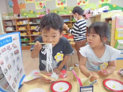 ソフトクリームマシーンで作ったトッピング付きソフトクリーム、てんぷらうどん、ホットドッグ、新しい寿司ネタ等が増え、以前よりも迷いながら子供たちは注文をしています。また、アイスキャンディーの棒には「あたり」の文字が書いてある物もあり、運ばれてくるのをワクワクして待っています。うさぎ組で人気の寿司は、玉子やサーモン、いくらです。スイーツやデザートは最後という家庭でされている約束を守りながら「お寿司たくさん食べたからデザート決めよう」と言ってメニューをじっと見ている姿が見られ、可愛いです。