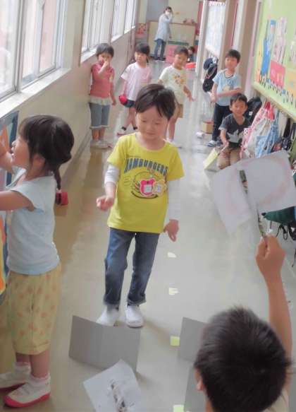お寿司を食べたてお腹がいっぱいになったので、次は廊下で「カード倒しゲーム」で遊びました。「すみっこぐらし」が大好きな友達がキャラクターを描いたカードに、りんごに見立てた新聞ボールを投げてカードを倒すゲームです。これまでも遊び続けているのですが、カードの並べ方をドミノのように1枚倒れるとその後ろも倒れる並べ方をするようになり、繰り返し遊ぶ中で面白いことを考えているなぁと驚きました。カードが倒れた枚数分が点数になるので最初の1枚に当たると複数枚倒れることもあり、よりドキドキ感が増すようです。ゲーム以外にも、○×の判定をしたり、スタートの合図をしたり、倒れた分の点数を表示したりする役割があるので、教師も加わり一緒に決めたり遊んだりしています。新聞を丸めたいびつさで、転がり方がその時によって違っていてそれも面白いです!