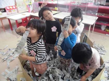 新聞遊びをしました。新聞をちぎって象さんの鼻にして「ぱおーん」となりきって遊んだり、丸めてボールにして投げたりして遊びました。最後はたくさんちぎった新聞を集めると、新聞プールに変身!「ざぶーん!」と入って遊びました。「水気持ちい!」「つめたいねー」と表現豊かな可愛いらしい子供たちでした。