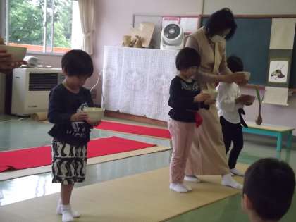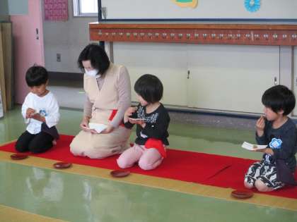 年長になって初めてのお茶教室がありました。お茶教室を楽しみにしてた子供たち。年中のときに経験していたことを思い出し、背筋を伸ばして座る座り方や、向かいに座っている友達を見ながら挨拶をし、お辞儀をすること等、講師の先生方の話を聞きながら真剣に取り組んでいました。おいしいお菓子とお茶をいただいたり、講師の先生方に「年長組になって初めてのお茶教室だけど上手でした」と褒められたりして笑顔がこぼれた子供たちでした。次回のお茶教室も今から楽しみにしています。