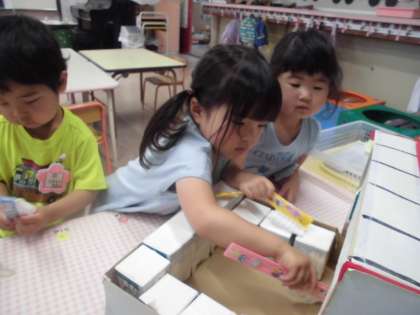 もも組では、歯ブラシをつくり、人形かば男くんの歯を磨いてあげました。かば男くんの歯がきれいになると、今度はねこの人形をもってきて「きれいにするよ〜」と歯磨きをする子供たちでしたよ。