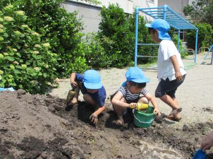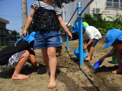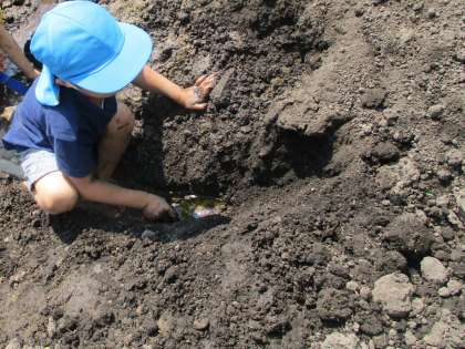 今日は朝の水やり後、外で泥遊びをしました。前回の遊びから、「ウォータースライダーつくろう」「道をつくってから少しずつ水を流していこう」と子供たち。乾いた土のところに水を足し、掘っては「流してもいい?」と聞きながら水を流したり、水の速さやどんなふうに掘ればいいか考えたりして遊びました。