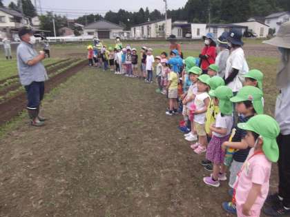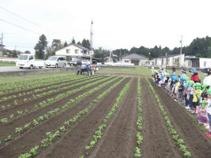枝豆の土寄せを見にいきました! 公開日 2021/06/08 更新日 2021/06/08 楽しい月岡幼稚園ニュース 6月8日(火) 5月に月岡校下ふるさとづくり推進協議会の方と一緒に枝豆の種植えをしました。散歩で、日々枝豆の芽の成長を楽しみにしていて、今日は、地域の方々が、トラクターで土寄せの様子を見せてくださいました。子供たちは、トラクターが大迫力で土を掘る様子に大喜びでした。