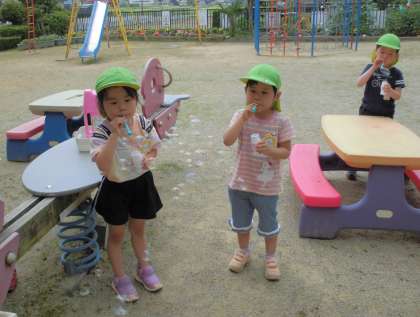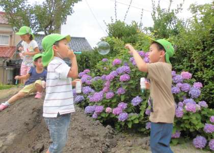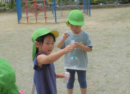シャボン玉とんだ(うさぎ組) 公開日 2021/06/22 更新日 2021/06/22 楽しい月岡幼稚園ニュース 6月22日(火) 今日はシャボン玉をして遊びました。昨年の経験もあってか、今日の姿を見ていると、大きいシャボン玉を作るためにゆっくり息を吹いたり、たくさんのシャボン玉を出すために、フーッと息を吹き続けたりしていました。また、幼稚園の上までとんでいったシャボン玉をずっと見続けて「やったー!」と、嬉しそうでした。風に吹かれてとんでいく様子を見て嬉しそうな子供たちでした。
