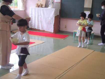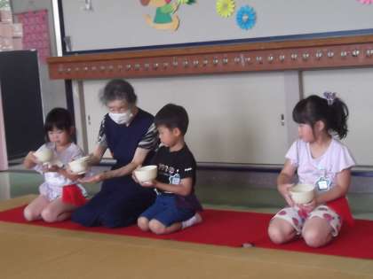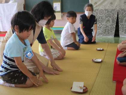 お茶教室をしました!2回目(ばら組) 公開日 2021/06/24 更新日 2021/06/24 楽しい月岡幼稚園ニュース 6月24日(木) 今日は子供たちが楽しみにしていたお茶教室がありました。お菓子やお茶の運び方、座り方等、講師の先生方に教わりました。真剣な表情で話を聞いたり、お茶を運んだりしています。先に運んだ子供たちは自分たちがお菓子とお茶をいただく番になると「おいしい」と嬉しさも大きかったです。