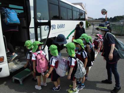 今日は待ちに待った遠足!子供たちの願いが届き朝から太陽が顔をのぞかせていました。初めての遠足やバスに、出発前からわくわくの子供たちでした。