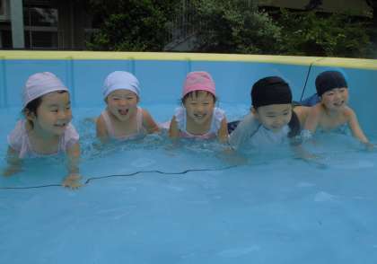 今日もプールに入りました。ワニ歩きのときは、昨日より顔を低く水面に近付けることに挑戦しました。あごや口を水に付けられた友達は、みんなに見てもらい嬉しそうでした。