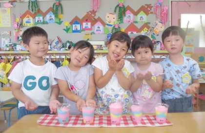 午後は、石鹸クリームを作って遊びました。回を重ねるごとに、水と石鹸の分量の配分がうまくなっています。今日は、魔法の粉(食紅)を入れて、カラフルなクリームに♪友達のクリームも重ねて、おしゃれスイーツ風に仕上げました。おいしそうでしょ!