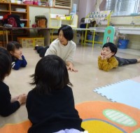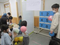 午後は、自分たちで作った的をぶら下げて水鉄砲をして遊びました。水を当てると、お化けを描いた面がクルクル回って何度も狙っていた子供たちです。「晴れるといいなぁ」と、言っている子もいましたが、天気の合間を見て戸外でできる遊びを十分楽しんでいきたいと思います。