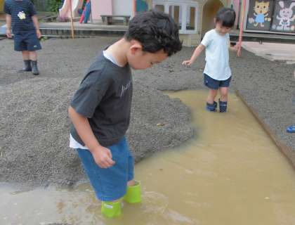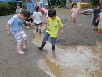 今朝はひどい雨でしたね。雨が降ってプールには入れなかったのですが、雨上がりの園庭に長靴を履いて水たまりを歩き回りました。子供たちが作った砂場の島の回りはたっぷりの雨水で驚きの声が上がりました。また、鉄棒の下にはたくさんの雫が下がっていて、指でつついてピチョンと落ちる様子を観察しました。