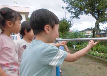 午後は、自分たちで作った的をぶら下げて水鉄砲をして遊びました。水を当てると、お化けを描いた面がクルクル回って何度も狙っていた子供たちです。「晴れるといいなぁ」と、言っている子もいましたが、天気の合間を見て戸外でできる遊びを十分楽しんでいきたいと思います。