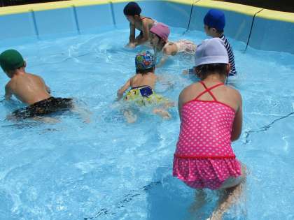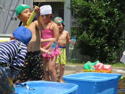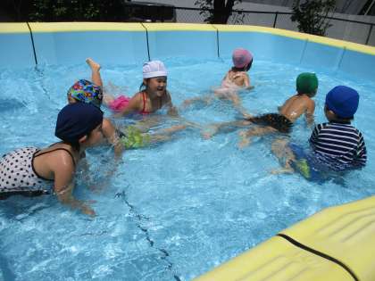子供たちが楽しみにしていたプールに入りました!プールの中をしゃがんだまま歩いたりワニ歩きをしたりしました。プールの壁に背中をつけたバタ足競争や両手をプールの床について足を伸ばしバタ足したりしました。顔にかかってもへっちゃらで、楽しい気持ちのほうが大きい子供たちでした。