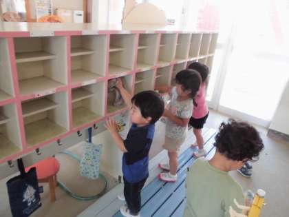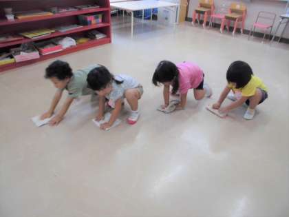 ぴかぴかになって気持ちいいね!(もも組) 公開日 2021/07/21 更新日 2021/07/21 楽しい月岡幼稚園ニュース 7月20日(火) 夏休み前の最後の幼稚園。今日はたくさん遊んだもも組の部屋を、みんなでぴかぴかに掃除しました。棚や下駄箱、床等を雑巾できれいに拭きましたよ。掃除するたびに、雑巾が汚れていくのを見て「こんなに雑巾汚くなった!」と驚く子供たち。たくさん掃除がんばったね!