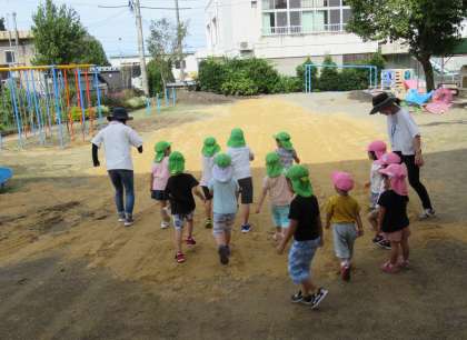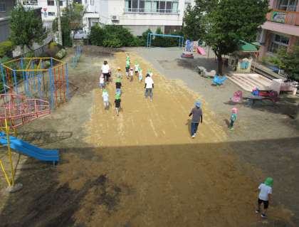 昨日の夕方、園庭に山砂が届きました。今年は、園庭で運動会を行うので、子供たちが走りやすいように、斜めになっている所を削ったり、雨で流された所に砂を敷いたりしました。登園してきた子供たちは、園庭の色が「黄土色になっててビックリした!」「色変わったね、どうしたの?」と次々に聞いてきました。もも組とうさぎ組で、砂を踏み固めるため、ジャンプをしたりドシンドシンと歩いたりしてくれました。かけっこをしても「走りやすい!」と言う子が多く安心しています。園庭での初めての運動会、子供たちと一緒に準備を進めています!