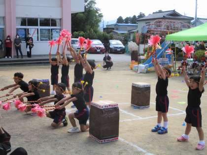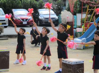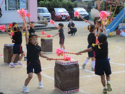 年中組は「これが日本のおまつりさ」のリズムをしました。元気なかけ声と共にバチと太鼓を使って勇ましく踊りました。家族に見てもらう喜びから腕がよりピーンと伸びていたり、しっかり前を見て踊ったりして一人一人の頑張りが感じられるかっこいいリズムでした。また、拍手をもらったことが嬉しくて、着替えをしている時には「やったー!」「楽しかった〜」と、口々に話し、それぞれの達成感や満足感を感じ喜びを表現する姿が印象的でした。
