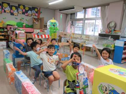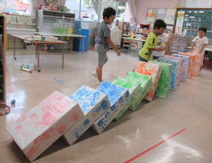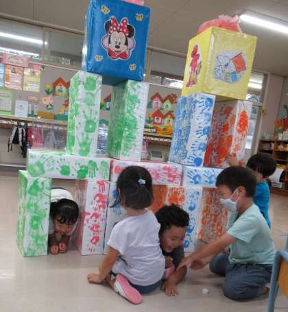 運動会の親子競技で使ったたくさんの箱を使って遊びました。運動会では高く積み重ねてタワーを完成させましたが、今日は、ドミノやトンネル、最後はバスにも変身しました。特に、ドミノはゆっくり倒れていく様子が面白くて全部倒れると歓声があがっていました。箱を近くに並べると倒れないから間を開けることや、並べ方によってジグザグや丸く倒れることも分かって嬉しい発見でした。少しのアイディアでまだまだ楽しめそうです。今度は何ができるかな?