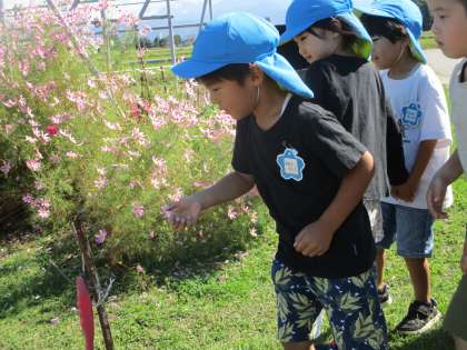 秋晴れの中、幼稚園周辺の秋を探しに散歩に出かけました。エノコログサやススキを見つけ、色の変化に気付いたり、柿の木を見付けたり秋を感じている子供たちでした。また、キンモクセイの木があり、いい匂いがするんだよと子供たちにつたえたときにはまだ気付いていなかった子供たちでしたが、帰りにまた同じ道を通ると「甘い匂いする」「いい匂いだね」と子供たちでした。いろいろな秋を探していきたいです!