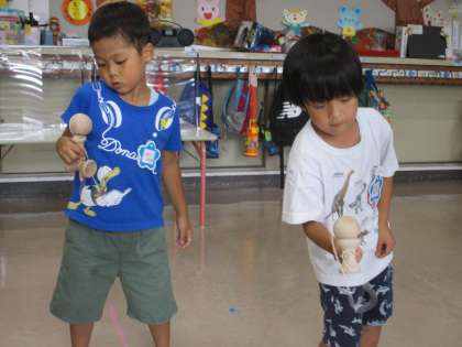 運動会のプレゼントにもらったけん玉を毎日楽しんで取り組んでいる子供たち。繰り返し技を練習することで「大皿」だけでなく「小皿」もできる子も増えてきました。「中皿」にも挑戦しています。子供たちの頑張りを認めて、意欲につなげていきたいと思います。