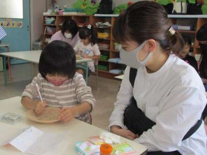 親子活動!陶器に絵付けをしたよ! 公開日 2021/10/29 更新日 2021/10/29 楽しい月岡幼稚園ニュース 10月29日(金) 今日は親子活動で陶器に絵付けをしました。親子でどんな絵を描きたいか考え、パステルを使って絵を描いていきました。親子でじっくりと取り組める時間となり、子供たちも嬉しい表情をしていましたね!いつできるのかな?と今から仕上がりを楽しみにしています。
