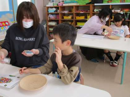 今日は親子活動で陶器に絵付けをしました。親子でどんな絵を描きたいか考え、パステルを使って絵を描いていきました。親子でじっくりと取り組める時間となり、子供たちも嬉しい表情をしていましたね!いつできるのかな?と今から仕上がりを楽しみにしています。