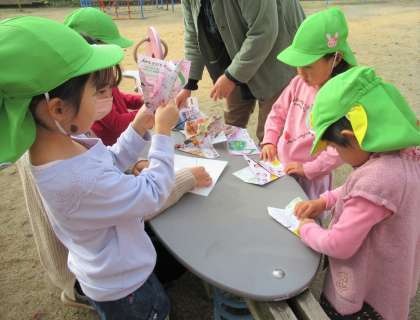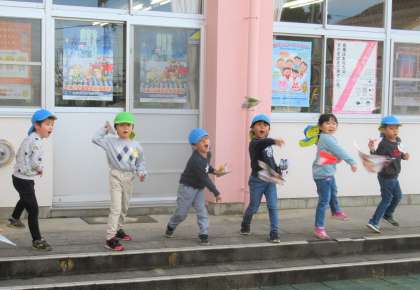 うさぎ組では紙飛行機の遊びが再燃中!「とんびひこうき」という折り方を覚えていろいろな紙で飛ばしています。今日は、年長組の友達も一緒に紙飛行機を飛ばして遊びました。「とんびひこうき」はその名のごとく「とんび」のように雄大に飛び、びゅ〜んと伸びやかに飛ぶ姿に夢中になっている子供たちです。今日は、子供たちが先生になって他の組の先生たちに教えていました。気持ちのいい天気の中、遠くまで飛ばしたい、戻ってくるように飛ばしたい、とそれぞれの願いに向かって何度も飛ばす子供たちでした。