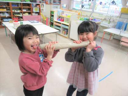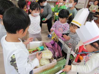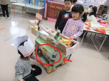 もも組パン屋さんに「電子レンジつくりたい!」と楽しいアイディアが子供たちから聞かれ、さっそく部屋にある廃材で子供たちとつくってみました。パンをレンジに入れると「じーーーー、チン!(鈴)」と言ってパンが焼けます。お客さんがもも組だけでは少なかったので、移動販売ができるパン屋さんに変身〜!!レンジも一緒に移動できるようにしました。ばら組やうさぎ組、職員室等、いろいろなところに行き「いらっしゃいませ〜、出来立てパンですよ〜」とたくさん売りにいきましたよ。一人で売るのが大変になると、友達と役割分担する姿も見られました。電子レンジが増えたことで、お客さんからは「あつい!でもおいしい!」と大好評でしたよ♪また盛り上がりそうです。