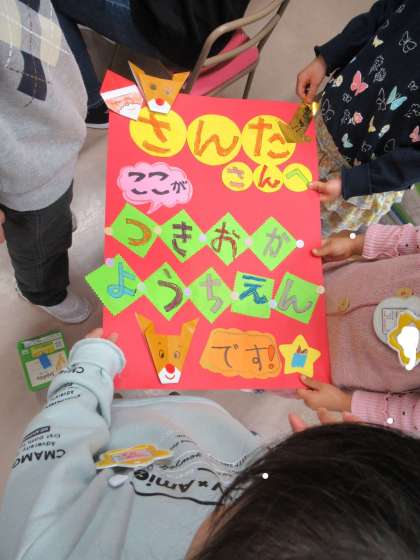 昨日、サンタさんから「20日の『冬のこども会』に行きます。待っていてね」とメールの返信が届きました。うさぎ組では「サンタさんが月岡幼稚園が分からなかったら困る」という声から目印を作ることにしました。自分の書ける文字を書いて色を塗ったり折り紙を折ったりしました。よく目立つようにと、玄関に貼り付けてあります。きっとサンタさんも迷わず来てくれることと思います♪