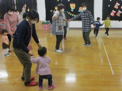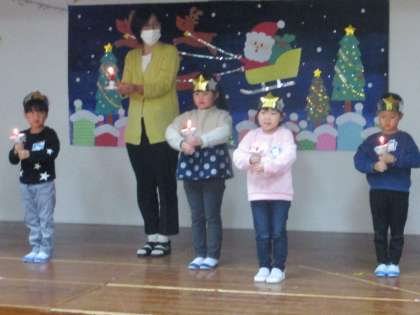 もうすぐ冬の子供会!キャンドルサービスの練習をしています。ばら組の子供たちが天使になって、今日は親子サークルのお友達に一足早く披露しました。その後は「サンタが街にやってくる」一緒に踊りました。20日は冬の子供会!サンタさんが来てくれるのを楽しみにしている子供たちです!