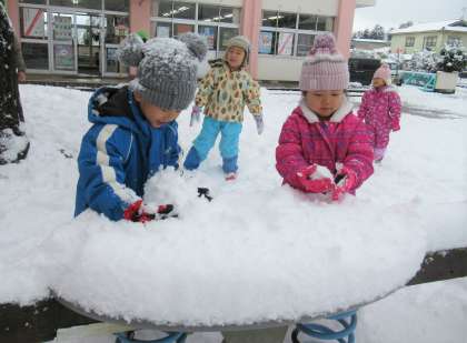 今日から給食が始まり、ゆっくり1日遊びを楽しむことができました。朝の晴れ間には雪遊びに出ました。サラサラの雪だったことで握っても丸まらないことを不思議がっていた子供たちです。
