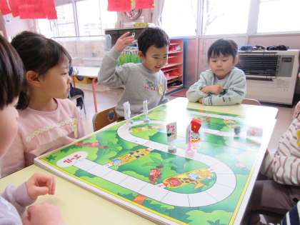 保育室では、すごろくを楽しみました。サイコロの見方やコマの進め方は個人差があったので、遊びながら「こうやって進むんだよ」と知らせています。せっかく進んだのに、少し戻ることになりゴールに辿り着くまでのドキドキ感がたまらない様子でした。今後は、自分たちですごろくのコースづくりをしたり、止まったコマの言葉(○○の真似をする、歌を歌う等)を考えたりして楽しんでいきたいと思います。