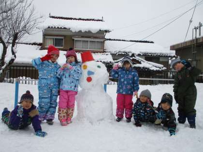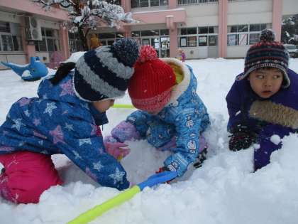 先週、雪だるまをつくり、顔のパーツに使った型抜きを探そうと園庭に出ました。雪の中を探偵のように「ここに雪だるまがあったからこの辺にあるかも」「ここを掘ってみよう」と探しました。型抜きを見つけると「あったー」と喜ぶ子供たちでした。